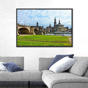A photographic panorama of Dresden’s riverfront buildings, boats on the river, and a green riverside beneath a calm summer sky. The realistic, rule-of-thirds composition and a soft palette of green, blue, white, brown, and grey give the scene a peaceful, scenic quality. Suited to modern or photographic interiors such as a living room, study, or hallway.