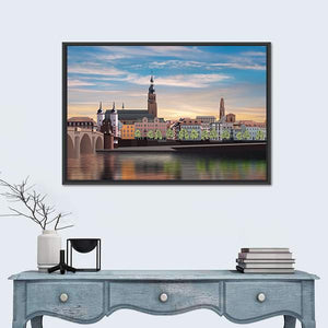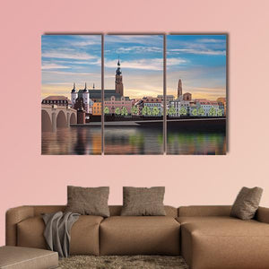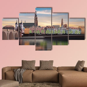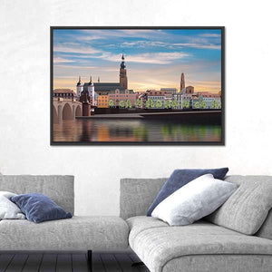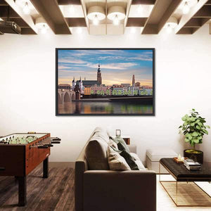 Panorama of Heidelberg captures a realistic cityscape with river, an arched bridge and a tall clock tower mirrored in calm water. The blue, tan, green and orange palette gives the scene a peaceful, picturesque mood. It works well as wall decor in modern living rooms or studies.
