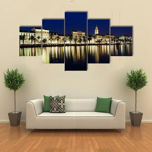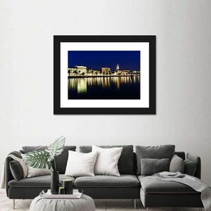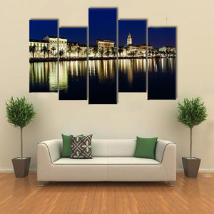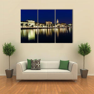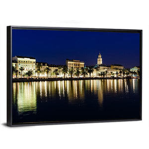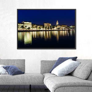 This horizontal canvas captures the coastal city skyline of Split at night, showcasing elegant reflections of lights on the water. With a palette of blues, yellows, and greens, it brings a vibrant and serene atmosphere to any space.