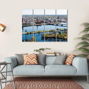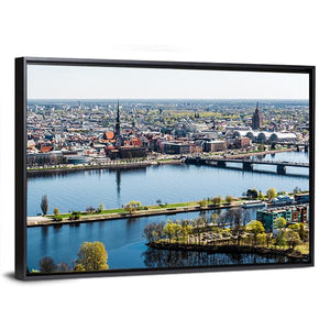 This canvas art captures a stunning aerial view of Riga's city skyline, featuring iconic buildings, a flowing river, and lush trees. The realistic depiction in shades of blue and green evokes an urban atmosphere, making it a captivating addition to your home decor.