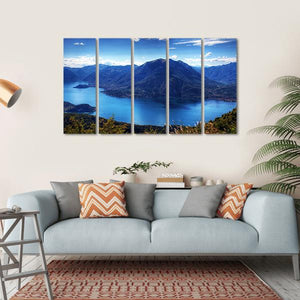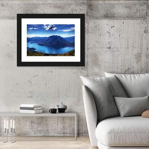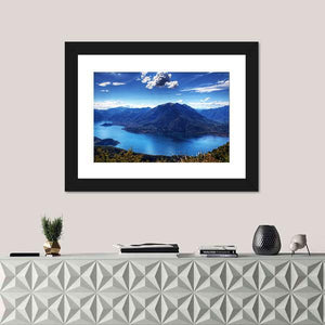 This beautiful canvas wall art captures the serene majesty of Como Lake and Lugano Lake, showcasing mountains, a tranquil lake, and fluffy white clouds. The artwork's high-angle perspective highlights the depth of the landscape, inviting a sense of calm and appreciation for nature.