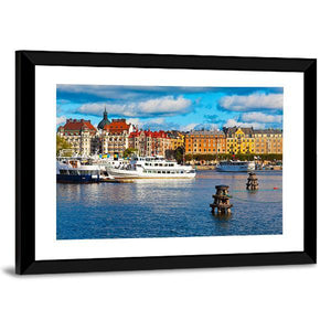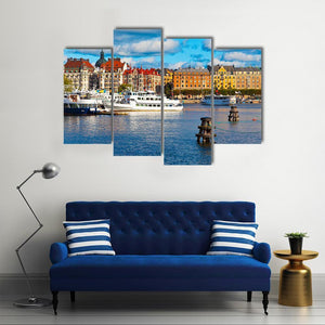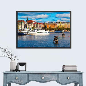This vibrant cityscape of Old Town in Stockholm captures a lively harbor scene with colorful buildings and boats. The sunny blue sky and sparkling water create an inviting atmosphere, perfect for bringing a touch of summer to your space.