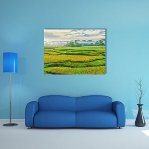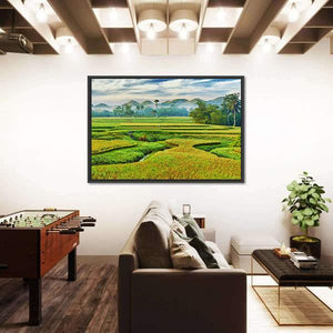 This canvas art showcases serene rice terraces nestled against distant mountains, creating a tranquil atmosphere. Soft mist lingers over the layered fields, highlighting the rich greens and yellows of the harvest.