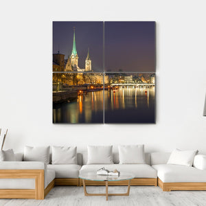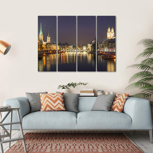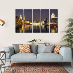 This canvas art captures the serene beauty of Zurich at night, showcasing illuminated riverfront buildings, a bridge, and charming churches. The cold, reflective waters enhance the tranquil atmosphere, making it a striking addition to any space.