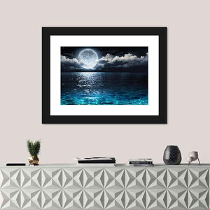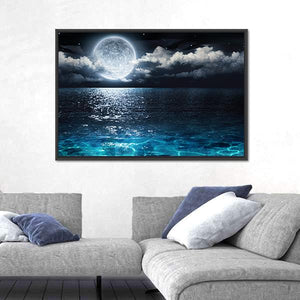 This canvas art captures a serene moonlit ocean under a clear night sky. With a luminous full moon surrounded by clouds and a sparkling reflection on the deep blue water, it adds a tranquil touch to your space.