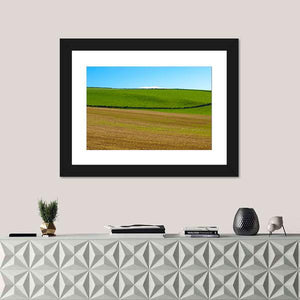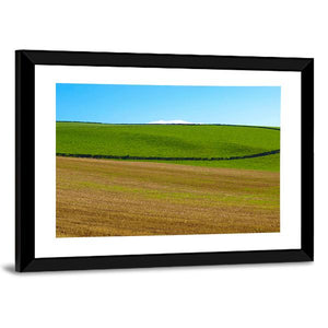 This canvas wall art depicts a serene landscape of rolling hills and fields, divided by a rustic stone wall. The natural palette of greens, browns, and blues evokes a calming atmosphere, making it a wonderful addition to spaces that celebrate nature.