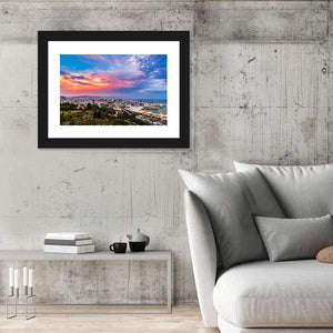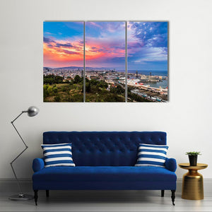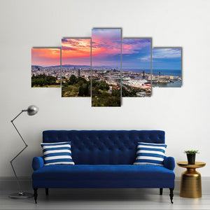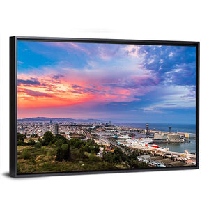 This canvas wall art captures a vibrant cityscape of Barcelona, showcasing a dramatic sunset sky over the bustling harbor and the densely built city. Its serene yet awe-inspiring atmosphere makes it a lovely addition to your space.