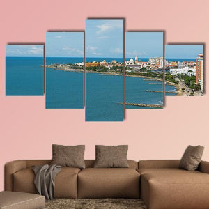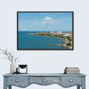 This panoramic canvas captures the coastal town of Cartagena, Colombia, showing white buildings with red roofs, breakwaters in the water, and trees along the shore. Rendered realistically in blues, whites, greens and browns, the scene feels peaceful and bright, suited to coastal or modern interiors.
