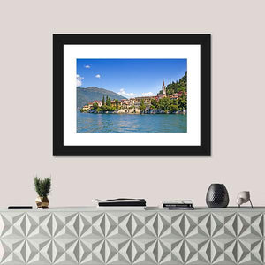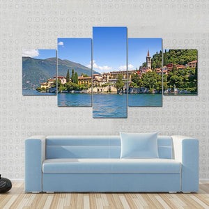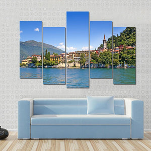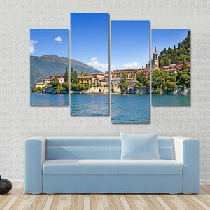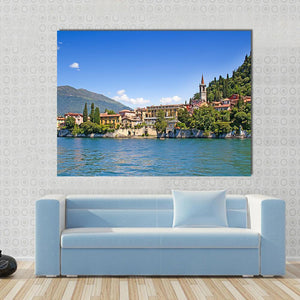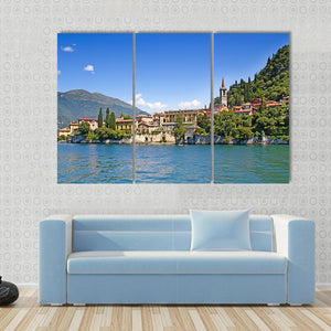 This landscape canvas captures the serene beauty of Cernobbio, a picturesque town by Lake Como, Italy. Featuring vibrant blue and green hues, the artwork showcases charming red-tiled roofs and tall cypress trees under a clear blue sky, making it a lovely addition to any room.