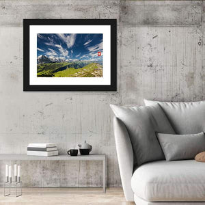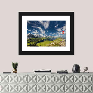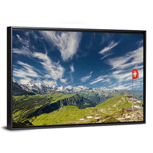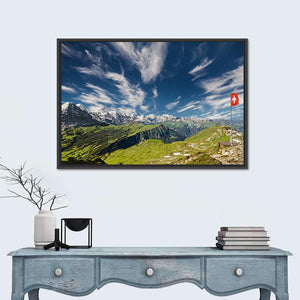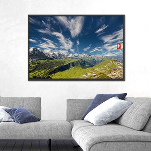 A panoramic view of the Swiss Alps, this canvas print shows snow-capped peaks, wispy clouds, and green hills under a clear daytime sky. The realistic, layered composition feels majestic and serene, with a wide-angle sense of depth. It makes a calm, natural statement as room decor in modern homes.