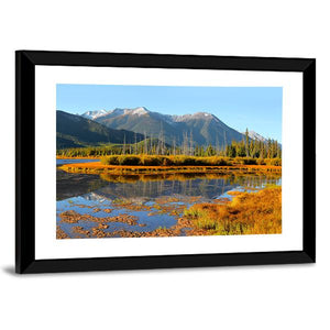 Panoramic View Of Vermilion Lakes presents a realistic landscape of snow-capped mountains, a calm lake, wetlands, reeds and mirrored tree reflections. The scene feels serene and peaceful in soft morning or evening light, and it fits modern or nature-inspired rooms such as living areas or home offices.