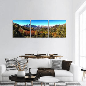 A panoramic, photorealistic depiction of a mountain range, autumn forest and valley, with snow-capped peaks and vibrant fall foliage. The scene feels serene and majestic, with blue, green and orange tones that suit nature-themed or modern interiors.