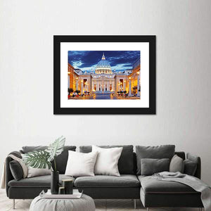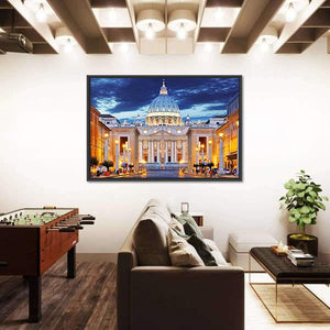 This photorealistic canvas captures the grandeur of St. Peter's Basilica, illuminated under a dramatic night sky. The serene colors of blue, gold, and white create a stunning focal point for any space, especially in settings that celebrate art and history.