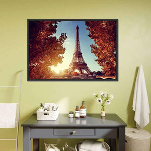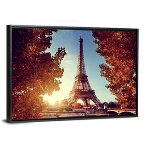 A vintage-style cityscape of the Eiffel Tower in Paris, shown with the river, boats and trees in autumn colors. Warm blues, browns, greens and orange leaves capture a golden-hour, vibrant mood that fits modern or vintage room decor.