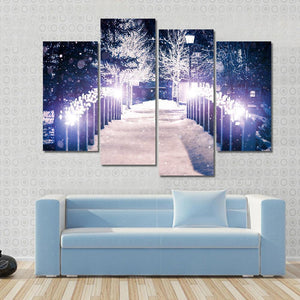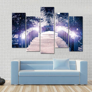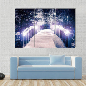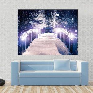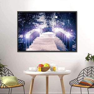 This enchanting landscape features a snowy path illuminated by soft lights and a charming street lamp, creating a serene and magical atmosphere. Perfect for adding a wintery touch to your home decor.