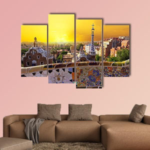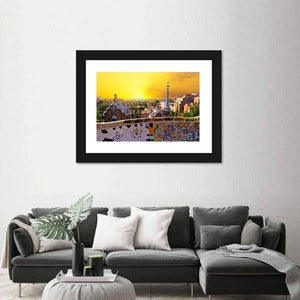An architectural cityscape showing park buildings, a tiled mosaic bench and a distant city skyline in warm, vibrant sunset tones. Tiled mosaic patterns, distinctive domed roofs and a tall spire appear in gold, white, blue, green and brown, a good fit for modern living rooms or travel-themed spaces.