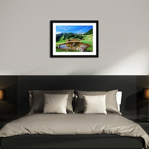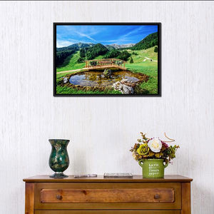This canvas art showcases a serene landscape featuring a pond, a charming wooden bridge adorned with flowers, and majestic mountains in the background. The natural palette of green, blue, and brown evokes a peaceful atmosphere, making it a wonderful addition to your home decor.