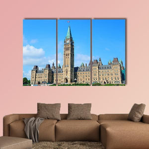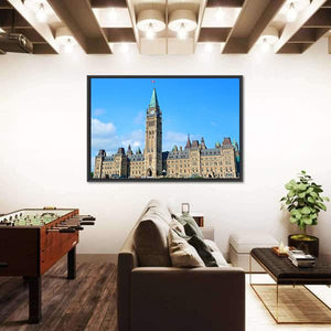 A realistic cityscape of Parliament Hill in Ottawa, Canada, centered on the parliament buildings and its clock tower with a green spire under a blue sky with clouds. The image reads grand and historic, using a soft palette of blue, beige, green, and gray. It works well as room decor in living rooms, offices, or entryways where a calm, majestic focal point is wanted.