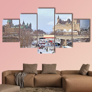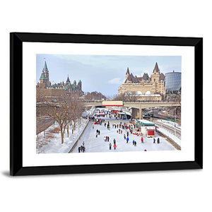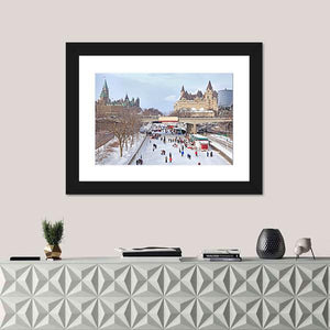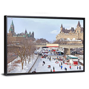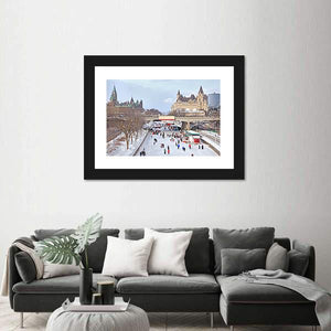 Parliament Of Canada In Winter shows the Parliament buildings beside a frozen canal where skaters glide on an active ice rink, captured from an aerial perspective. The realistic cityscape uses blue, white, brown, and grey tones to convey a festive, lively daytime winter scene. It works well in modern home interiors as a piece of room decor with urban energy.