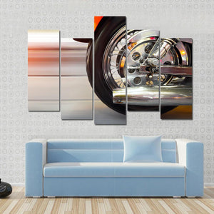 This canvas wall art captures the dynamic beauty of a motorcycle with a close-up view of its wheel and exhaust pipe. The motion blur and striking palette of orange, silver, and black create an energetic vibe, making it an ideal choice for modern room decor.
