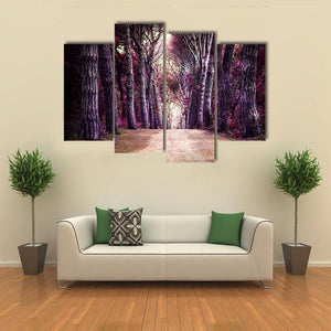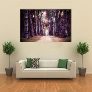 This enchanting canvas art depicts a serene forest path, inviting you to wander into the depths of nature. With its mystical palette of purple, brown, and pink hues, it beautifully captures the essence of a magical woodland retreat.