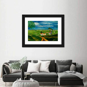 This charming canvas art features a serene village scene with rolling green hills, rustic countryside houses, and a winding road. The peaceful ambiance is enhanced by vibrant red-tiled roofs and fluffy white clouds, making it an idyllic addition to your home decor.