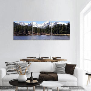 Snow-capped mountains, a dense pine forest, and a calm lake stretch across this panoramic canvas, giving the scene a serene, majestic feel. Rendered in realistic detail with blue, white, green, brown, and gray tones and a clear sky reflected on still water, it suits modern or nature-inspired rooms.