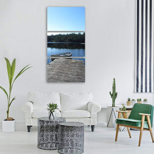 A serene lake scene with a wooden dock and a small white boat tied at the water’s edge. Calm blue water reflects the sky while a dense green forest fills the background, and the dock’s leading lines guide the eye for a tranquil, rustic feel. Suits rustic living rooms, bedrooms, or cabin-style spaces.