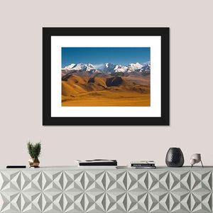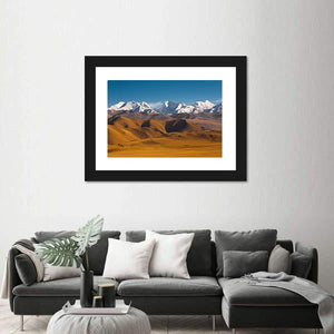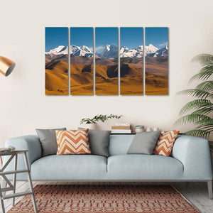 This canvas wall art features majestic snow-capped mountains and golden hills beneath a serene blue sky. Capturing the natural beauty of the Himalayas, it invites a sense of calm and grandeur to any space.