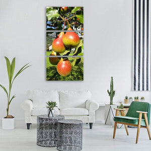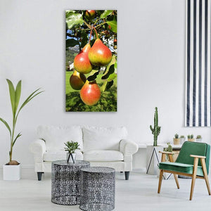 Four pears hang from a sunlit branch amid green leaves, depicted in greens, reds, yellows and warm browns. The composition follows the rule of thirds for a fresh, vibrant, natural feel, with sunlight dappling through the leaves. This fruit-focused canvas fits well in kitchens, dining areas, or modern rooms that favor nature-inspired wall decor.