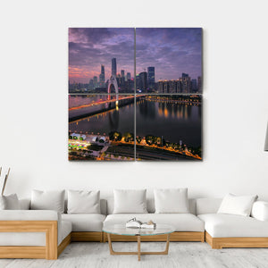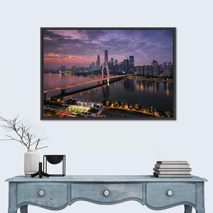 This canvas wall art captures the serene beauty of the Pearl River in Tianhe, showcasing a vibrant city skyline at sunset. With its dramatic clouds and illuminated bridge arches reflected in the water, it adds a tranquil yet striking element to your decor.