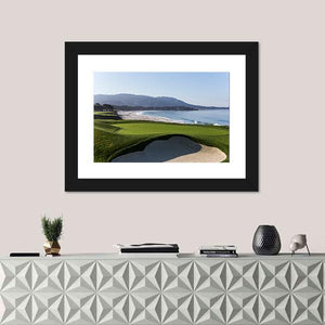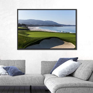 Pebble Beach, California captured as a realistic landscape showing the golf course meeting the coast. The print highlights the green and a sand trap in the foreground, with waves on the shore, people on the beach and distant mountains for a serene, picturesque mood. This coastal scene works well in house room decor and modern, nature-focused interiors.