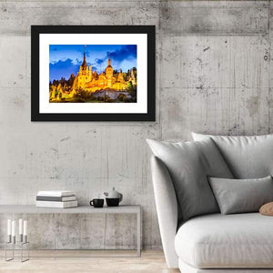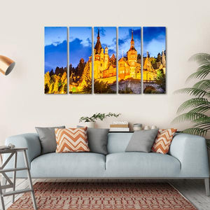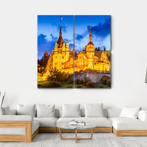 This canvas print showcases Peles Castle, an architectural gem nestled amidst serene trees. With a magical and majestic atmosphere, the artwork features illuminated towers against a dark blue sky, creating a stunning focal point for your wall.