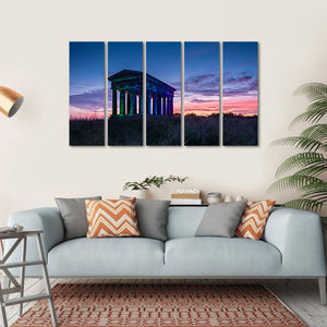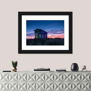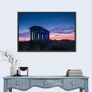 This canvas art features the Penshaw Monument set against a dramatic dusk sky. The scene, with its tall columns illuminated by colorful lights, evokes a mysterious and serene atmosphere, perfect for adding depth to your wall décor.