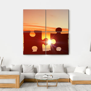 This artwork captures the essence of connection through silhouetted figures and puzzle pieces illuminated by sunlight. With its vibrant orange and yellow palette, it inspires a sense of hope and collaboration, making it a compelling addition to any space.