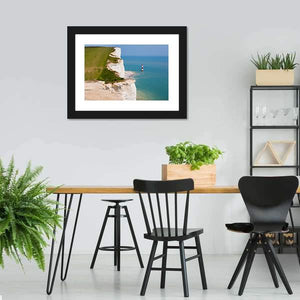 This landscape canvas art captures a majestic scene of coastal cliffs, featuring a striking red and white striped lighthouse against a serene backdrop of clear blue water. Its realistic portrayal invites a sense of calm and wonder, making it a great addition to any nature-inspired décor.