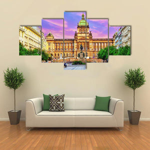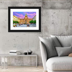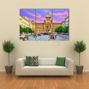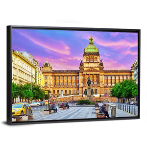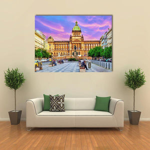 This vivid canvas wall art captures the bustling energy of Wenceslas Square at night. Featuring an ornate building with a dome and a statue, the piece brings a vibrant atmosphere to any space with its dramatic sunset sky and lively scene of people enjoying the square.