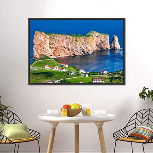 This canvas wall art depicts a picturesque coastal scene featuring the distinct rock formation of Perce Rock, surrounded by a charming village and the ocean. Bright colors and a serene atmosphere make it an uplifting addition to your decor.