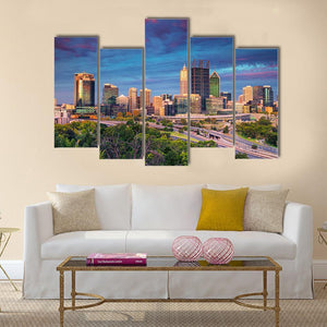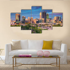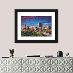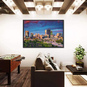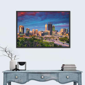 This canvas shows the Perth city skyline at sunset, with skyscrapers, winding roads and clouds lit in gold against blue and gray tones. The composition feels vibrant and dramatic with a modern urban mood. It pairs well with contemporary living rooms and urban-style room decor.