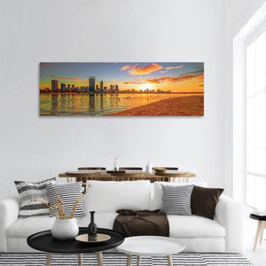 Perth skyline from the Swan River is shown across a panoramic canvas, capturing the city, beach and ocean at sunset. Warm oranges and golds meet cool blues and greys in a photorealistic, modern scene with silhouetted birds and clouds catching the sunset light. The serene yet vibrant mood fits modern or coastal interiors as a calm focal piece.