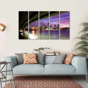 This vibrant canvas art captures a stunning view of a city skyline across water at sunset, framed by the geometric structure of Narrows Bridge. The serene palette of purple, blue, and yellow creates a lively yet peaceful atmosphere that enriches any décor.