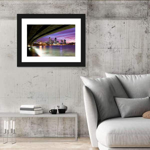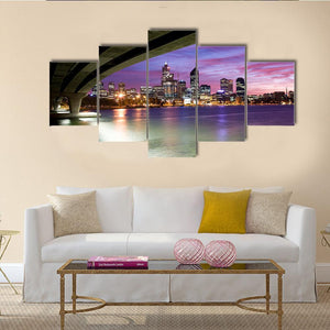 This canvas depicts Perth’s skyline and the Narrows Bridge seen from beneath, looking out over water toward a dramatic dusk sky. Purple, blue and orange tones with lights reflecting on the water create a serene yet vibrant, modern cityscape. It works well in contemporary, urban living spaces and modern room decor.
