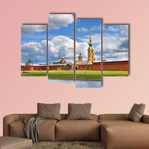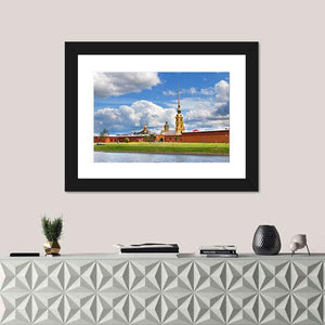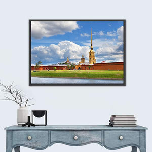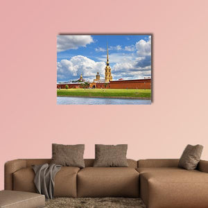 Peter And Paul Fortress in Russia appears in a realistic landscape highlighting a tall golden spire and red brick walls beside a calm river. Soft blue and green tones, bright sunlight and fluffy white clouds create a bright, sunny, serene mood. The rule-of-thirds composition and realistic style suit modern room decor.