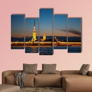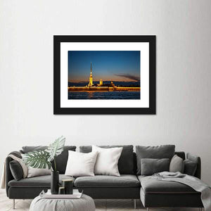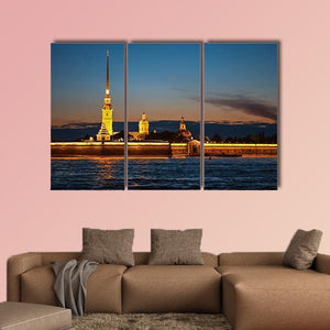 Peter and Paul Fortress on Hare Island appears at night in this realistic canvas print, featuring a tall, illuminated spire and warmly lit fortress walls against a blue, yellow, and orange dusk sky. The scene feels serene and majestic, with calm river reflections and city lights. It suits modern room decor and wall art collections that favor historical landscapes.