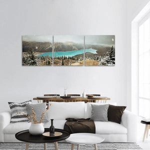 Peyto Lake in winter presents a realistic panoramic view of a vibrant turquoise lake, snow-dusted pine trees, and misty mountains. The scene feels serene and wintry with falling snow and a cool blue-gray palette. It suits modern room decor such as living rooms or offices.
