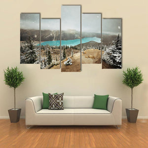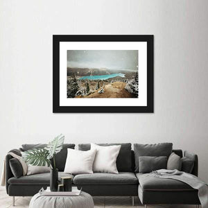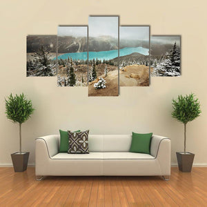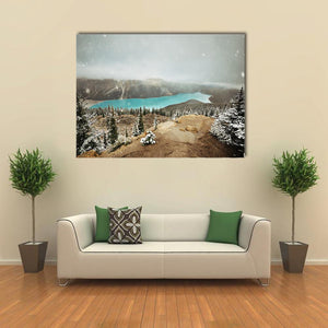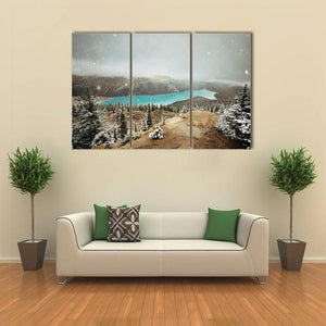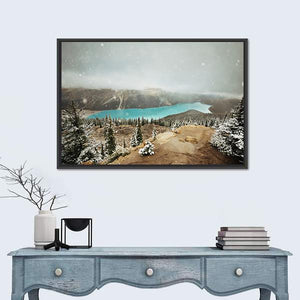 This canvas art features a breathtaking view of Peyto Lake surrounded by snowy trees and misty mountains, capturing the serene beauty of winter. Its atmospheric tones of blue, green, and white invite a sense of calm to any space.