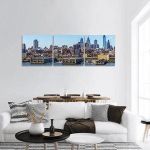 A panoramic photographic canvas of the Philadelphia skyline and riverfront buildings, rendered in a realistic daytime scene. The bright, urban palette of blue, brown, gray, and white gives a scenic city atmosphere that suits modern living rooms or offices as wall decor.