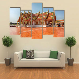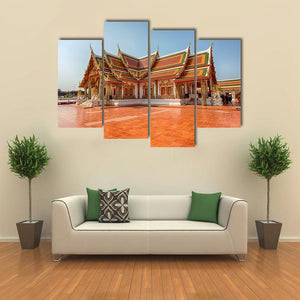 Photorealistic canvas print of Phra That Choeng Chum captures the temple and its tiled courtyard from an eye-level, symmetrical viewpoint. Warm golds, reds, greens and blues give the scene a bright, serene and majestic feel. This architectural image suits home room decor such as living rooms or hallways and works with modern or traditional interiors.