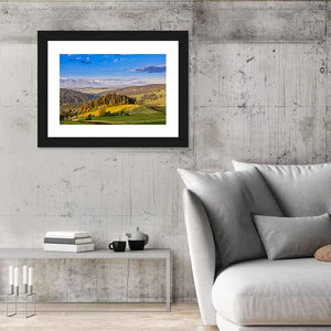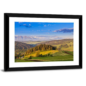 An atmospheric canvas print of the Pieniny Mountains in Poland, showing layered peaks, a coniferous forest, green rolling fields and patches of tilled earth under a blue sky. The photorealistic landscape uses depth and rule-of-thirds composition to create a peaceful, scenic mood. Suits modern home décor, including living rooms and bedrooms.