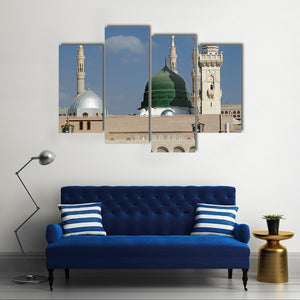 This canvas wall art showcases the majestic mosque architecture of Masjid-E-Nabawi. Its serene colors and wide-angle view capture the beauty of the green and silver domes against a clear blue sky, making it a striking addition to your space.